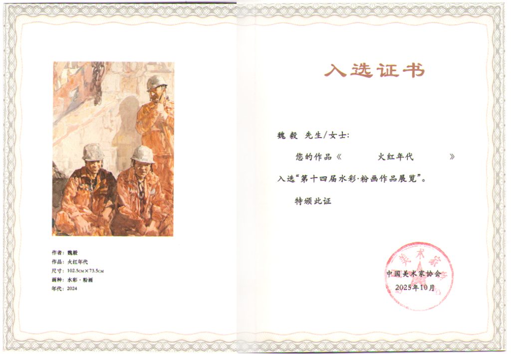 《火红年代》 102.5cmx73.5cm 展览招贴 Exhibition poster 展览现场与作品合影 Group photo of exhibition site and works 入选证书 Certificate of Selection 文章导航 作品《岁月之痕》获“第十四届黑龙江省美术作品展览”金奖The work “Traces of Time” won the Gold Award at the 14th Heilongjiang Provincial Art Exhibition 作品《兴安秋韵》入选“第四届小幅水彩画展览”The work ‘Autumn Charm of Xing’an’ was selected for the ‘4th Small Watercolor Painting Exhibition’